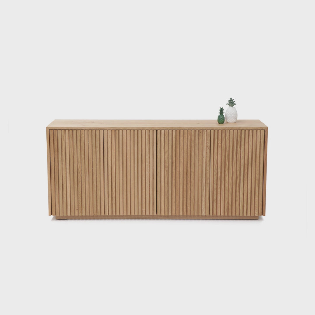 Le buffet Denmark est une pièce qui représente le mobilier nordique. La façade à lattes ajoute du style à votre espace tout en conservant une apparence de rangement discrète, vous permettant de ranger tout ce dont vous avez besoin. Système Tic-tac sur les portes pour une utilisation quotidienne fluide et discrète.