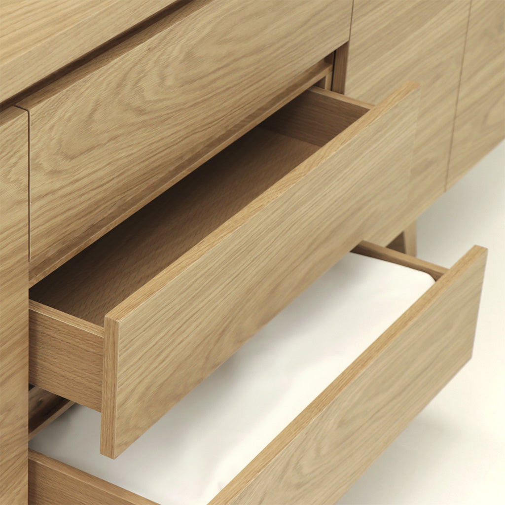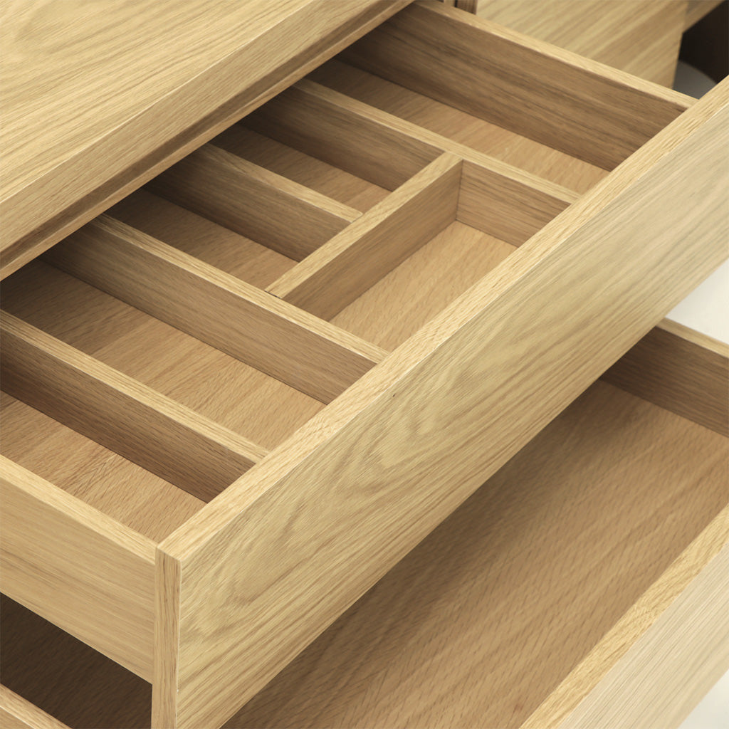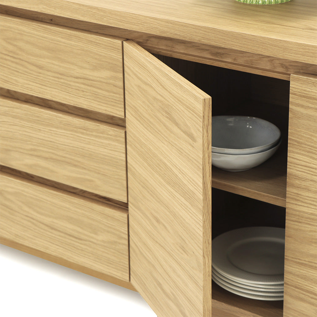 Le buffet dispose de 4 portes et 3 tiroirs pour tirer le meilleur parti de votre espace de rangement. Le tiroir supérieur est doté de séparateurs pour une meilleure organisation.